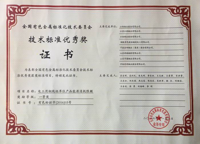 與此同時,我公司獲得由全國有色金屬標準化技術委員會頒發的“技術標準優秀獎(一等獎)”。